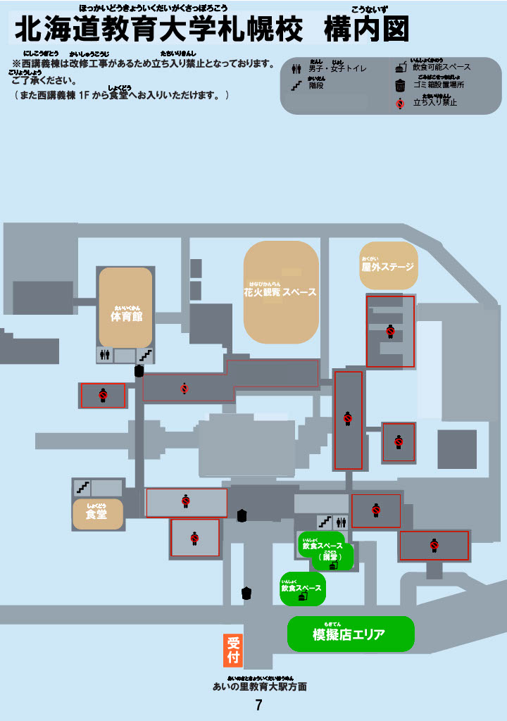 屋外ステージ周辺及びA研究棟・B研究棟渡り廊下の下の通路は、タイルの荒れや段差などがあり特に注意が必要です。スマートフォンのライトなどを使用するなどして足元に十分注意し、ゆっくり安全に移動いただきますようお願いいたします。